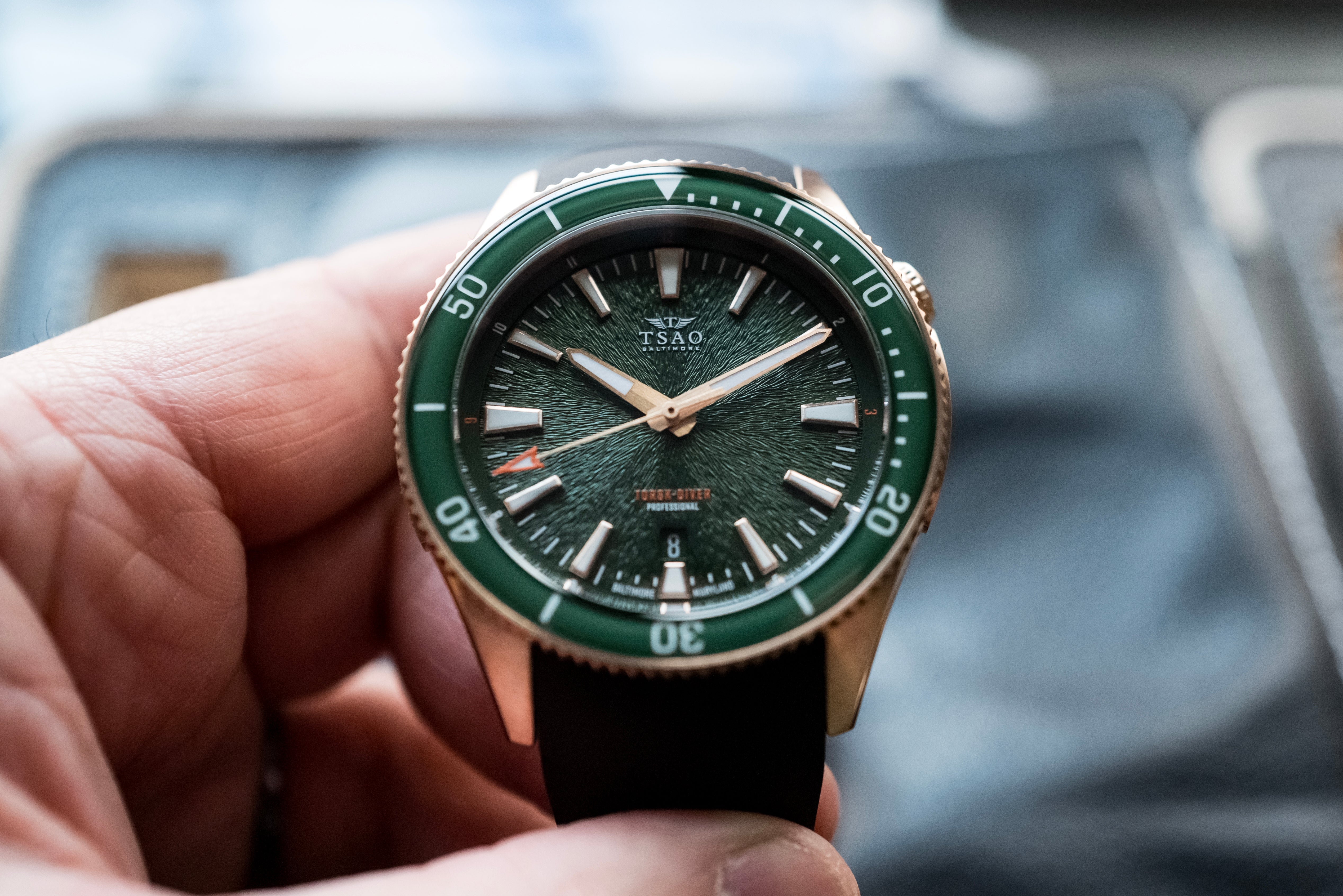 The Bronze Torsk-Diver Professional is the newest Diver in the Tsao Baltimore collection and the long awaited followup to the original Torsk-Diver that launched in 2019. Some enhancements include a more refined design, blue BGW9 lume, textured dial, and a Maryland assembled automatic movement called the MD-1.