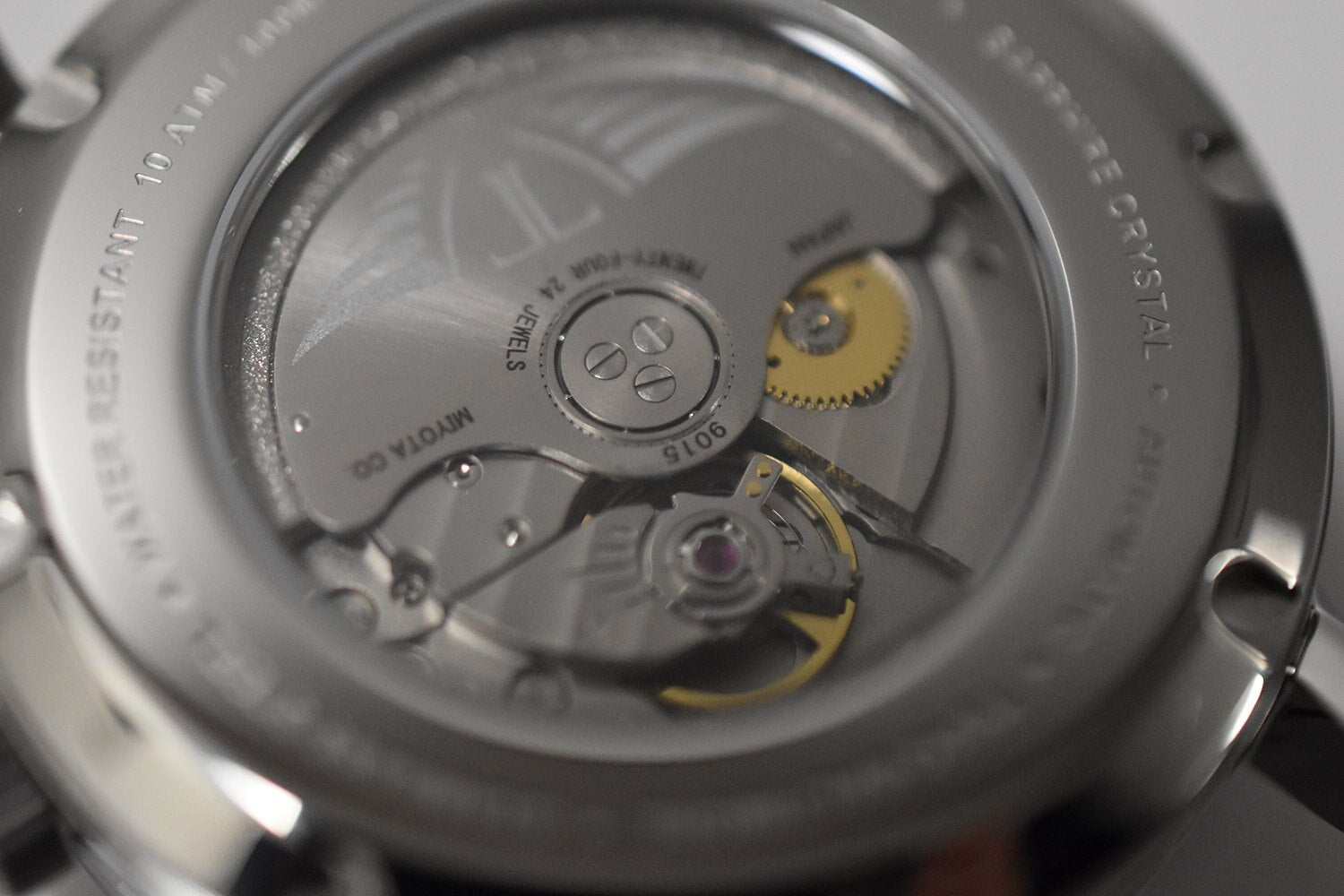 The 9015 has a 42-hour power reserve and is powered by the motion of your wrist simply performing daily activities. It can also be manually wound by the crown. Just rotate the crown and turn roughly 20 times for a full charge.