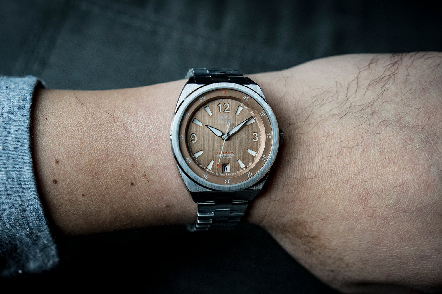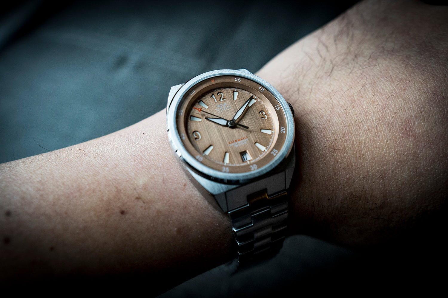 The Legacy 36 takes on an angular tonneau case design. The industrial brushed finishing emphasizes the sharp lines of the design, while the raised external bezel gives the case a bold visual presence on the wrist.