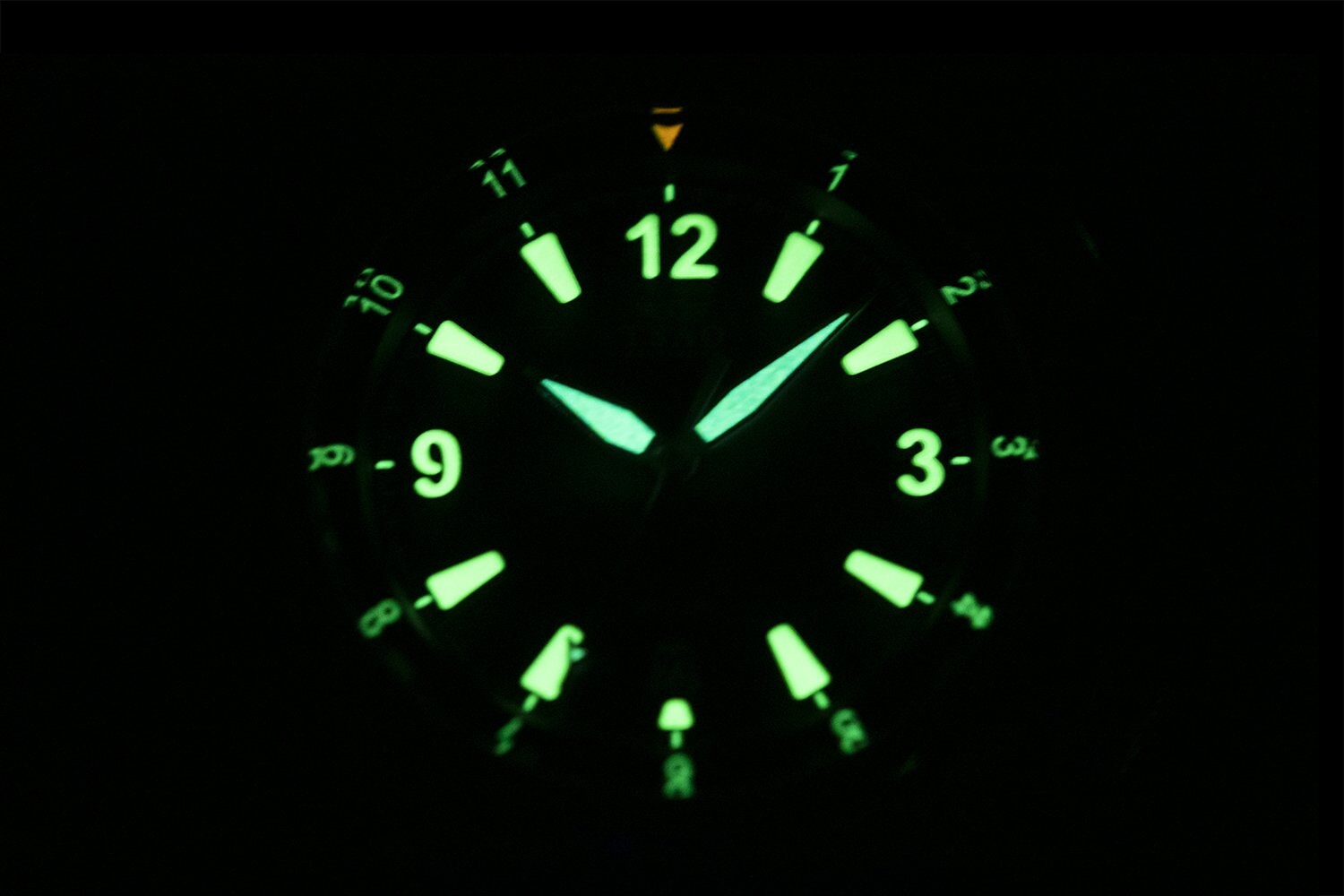 The 40mm Legacy takes on an angular, modernist take on the super compressor dive watch formula. The case combines distinctive dual crowns at 2 o’clock and 4 o’clock with a razor sharp tonneau case design. The industrial brushed finishing emphasizes the sharp lines of the design, while the raised external bezel gives the case a bold visual presence on the wrist. In keeping with the super compressor dive watch look, the Tsao Baltimore Legacy offers a dive-ready 200 meters of water resistance.