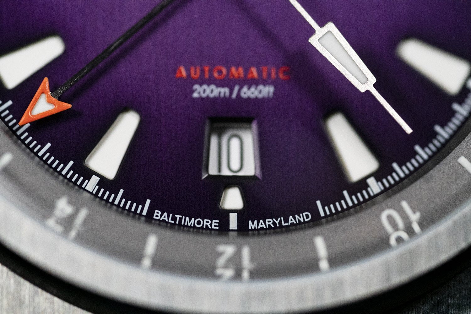 The Legacy is offered in four dramatic colorways inspired by the history and feel of Baltimore itself. Each dial option combines a tall bidirectional internal rotating bezel with deep cutouts for the mix of lumed Arabic numerals and indices, along with classic pilot watch style hands and a heavily textured degradè dial finish. From here, each of the four colors imbues the dial design with its own sense of character.