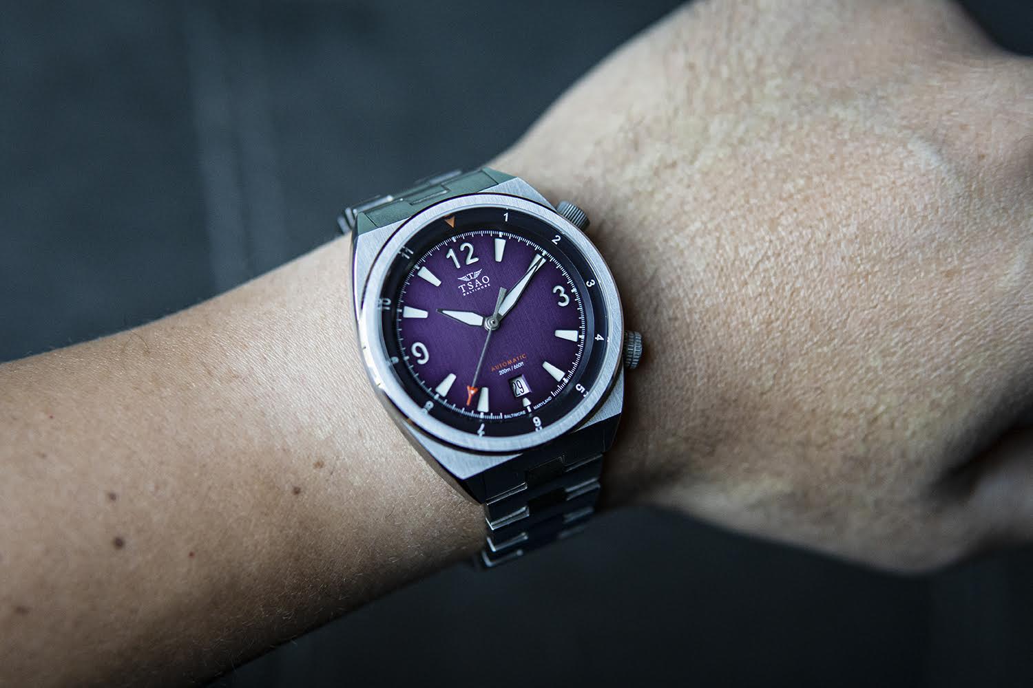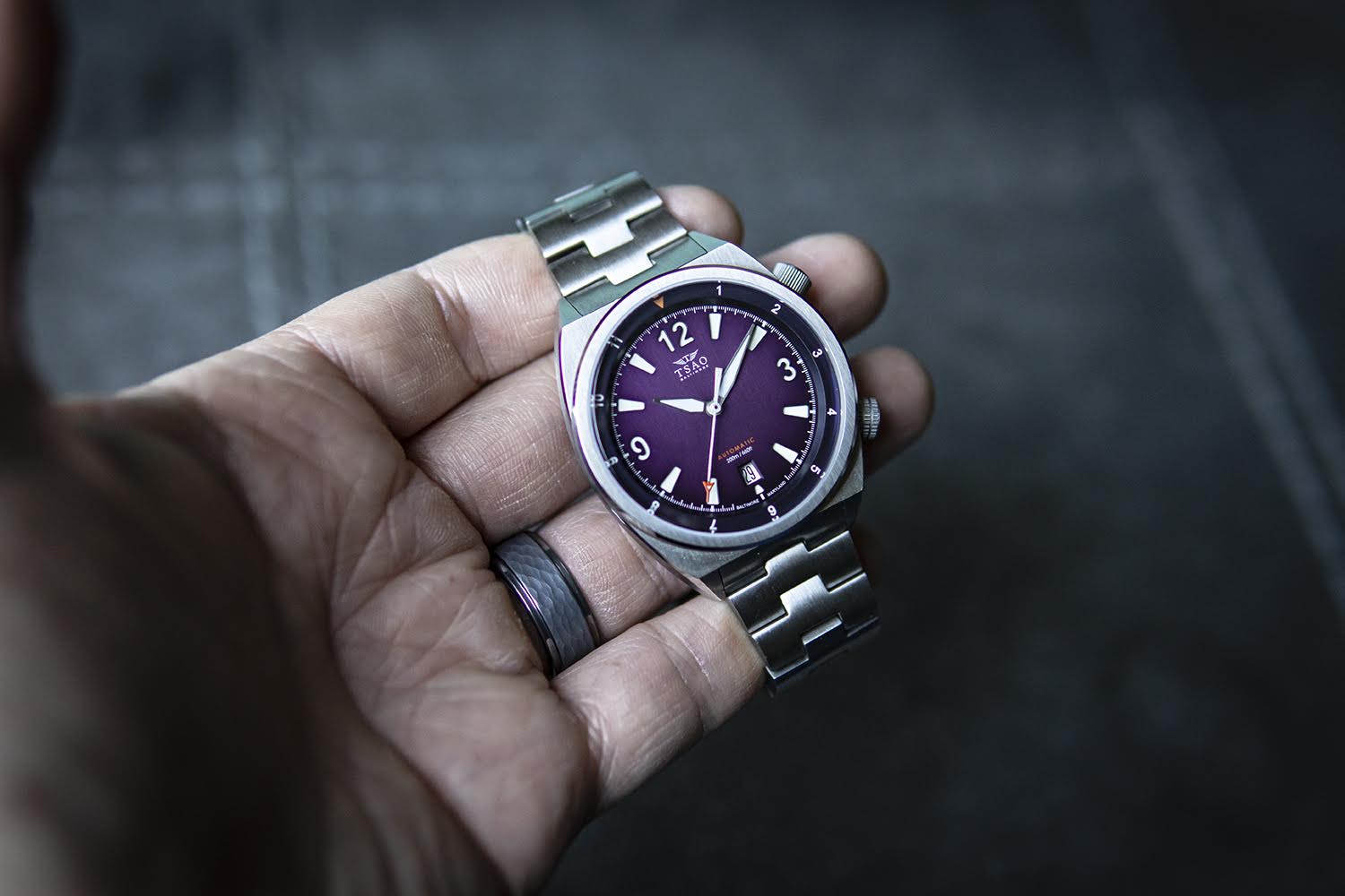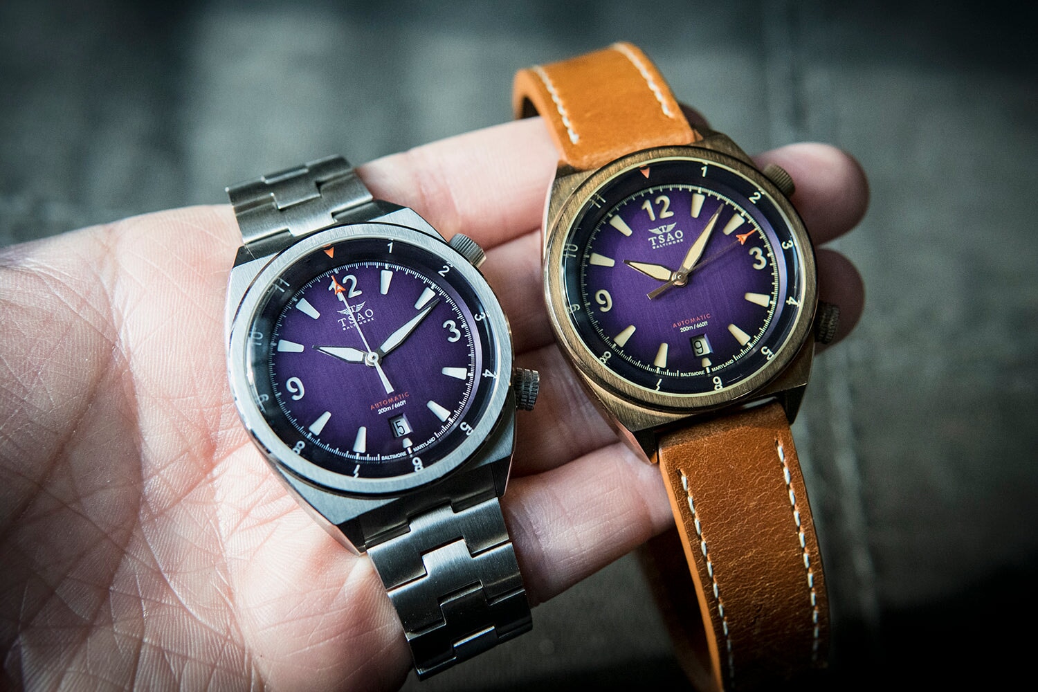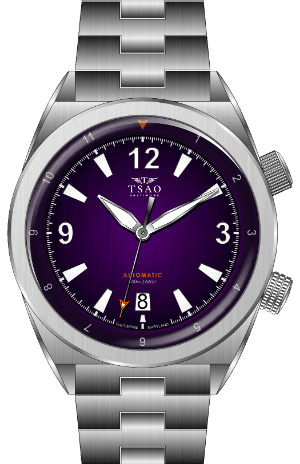 The 40mm Legacy takes on an angular, modernist take on the super compressor dive watch formula. The case combines distinctive dual crowns at 2 o’clock and 4 o’clock with a razor sharp tonneau case design. The industrial brushed finishing emphasizes the sharp lines of the design, while the raised external bezel gives the case a bold visual presence on the wrist. In keeping with the super compressor dive watch look, the Tsao Baltimore Legacy offers a dive-ready 200 meters of water resistance.