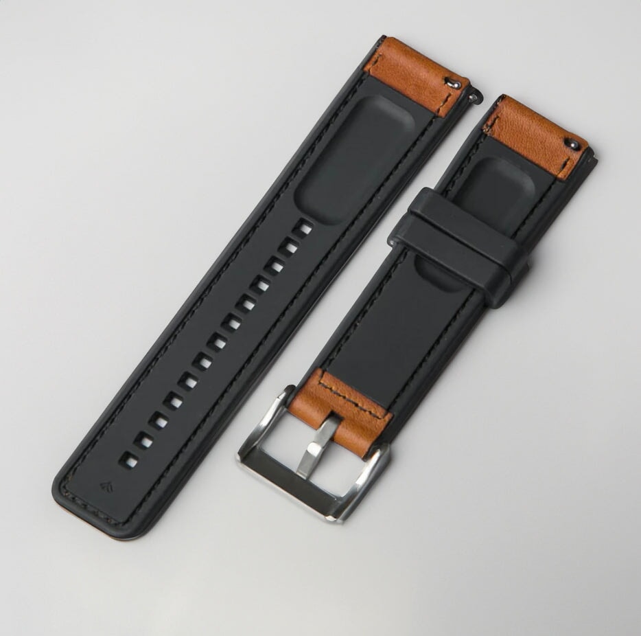 This Hybrid watch strap has a calf leather top and an all-weather FKM rubber base. This FKM rubber core strap is soft and flexible, and its sporty style complements the Balt-Pilot and Legacy collection perfectly.