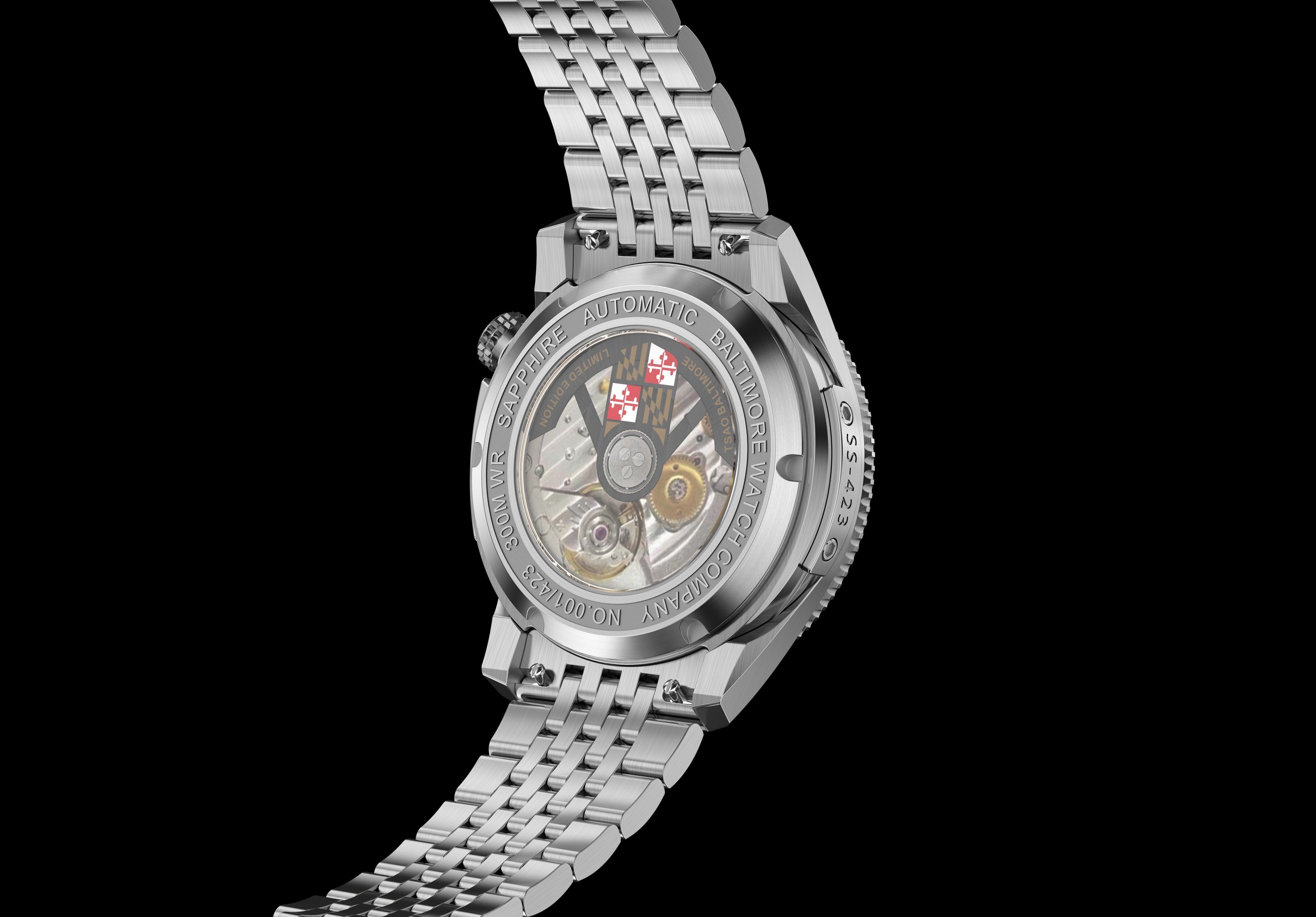 Each dial is made using a multi stamping process to create textured sunburst. The micro-adjustable bracelet clasp and see-through caseback complete a design that honors exploration, craftsmanship, and Baltimore’s maritime heritage.