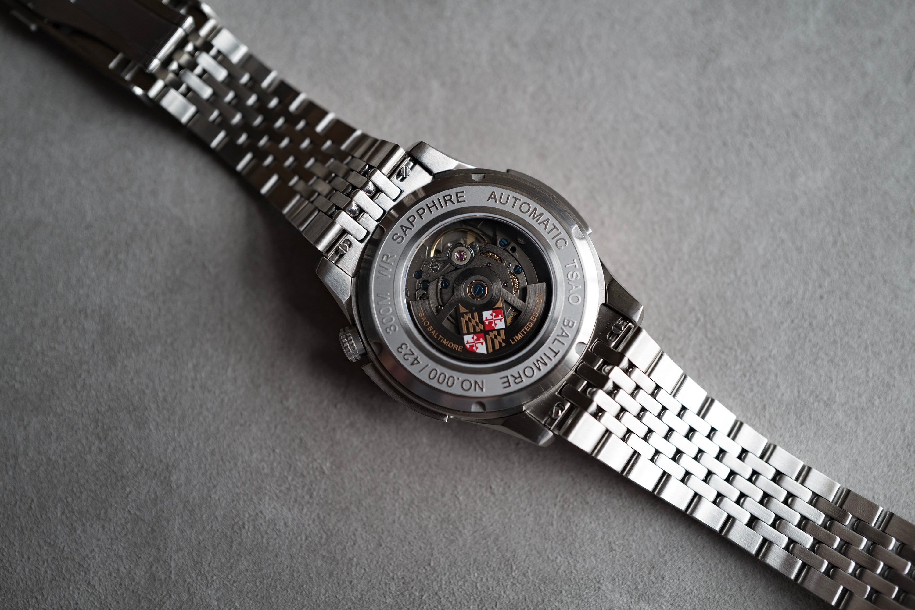 Powered by the MD-1. A fully assembled, regulated, and tested automatic movement from Maryland. Each timepiece is regulated in 4 positions to +-8 sec/day in accuracy.