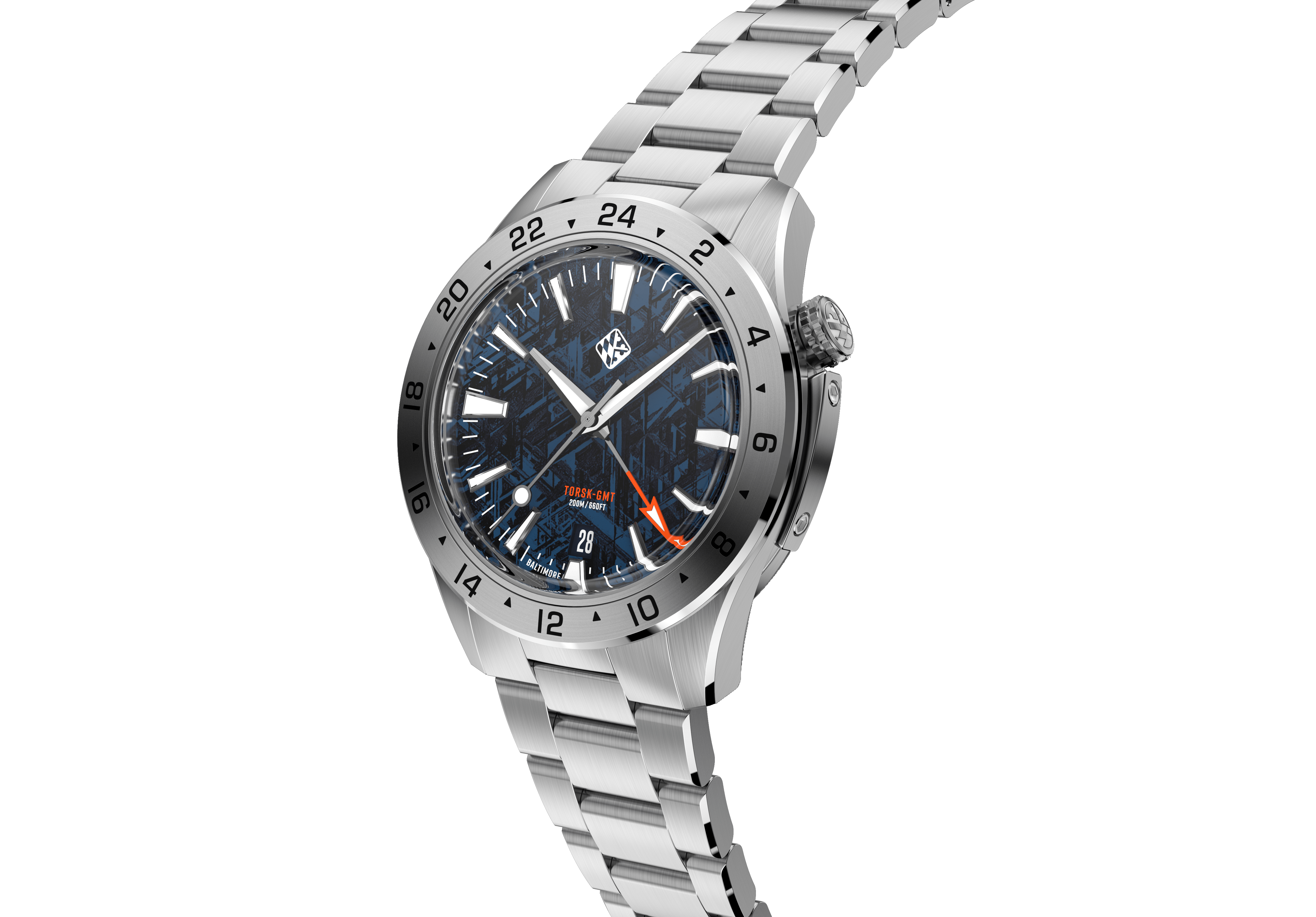 Inspired by the legendary USS Torsk (SS-423) submarine docked in Baltimore’s Inner Harbor, the Torsk GMT 39 is built for those who navigate both land and sea.
